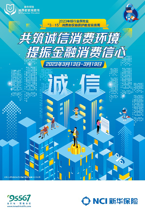 2023年“3·15”期间,新华保险积极贯彻落实银保监会关于开展2023年银行业保险业“3·15”消费者权益保护教育宣传活动的统一要求和部署,精心策划开展系列活动,与消费者一起共筑诚信消费环境,提振金融消费信心。