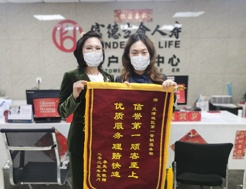 5月5日,客户家属委托业务员至富德生命人寿天津分公司城区第一服务部机构柜面致谢,并赠予锦旗,对富德生命人寿优质高效的理赔服务予以充分肯定。