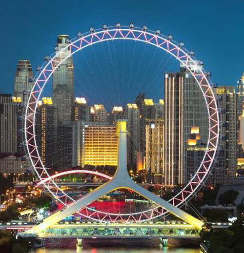 天津永乐桥摩天轮,被誉为“天津之眼”,跨海河连接河北区与红桥区,跨河建设,桥轮合一,兼具观光和交通功用,是亚洲唯一建在桥上的摩天轮,也是天津的标志性地标之一。(人保财险天津市分公司)