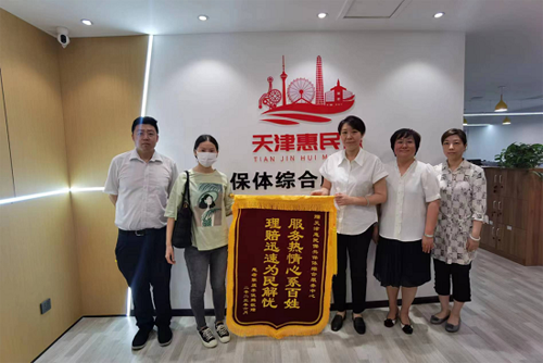 日前,一名参保人家属到天津惠民保综合服务中心赠送印有“服务热情心系百姓 理赔迅速为民解忧”字样的锦旗,表达获赔后的感激之情。