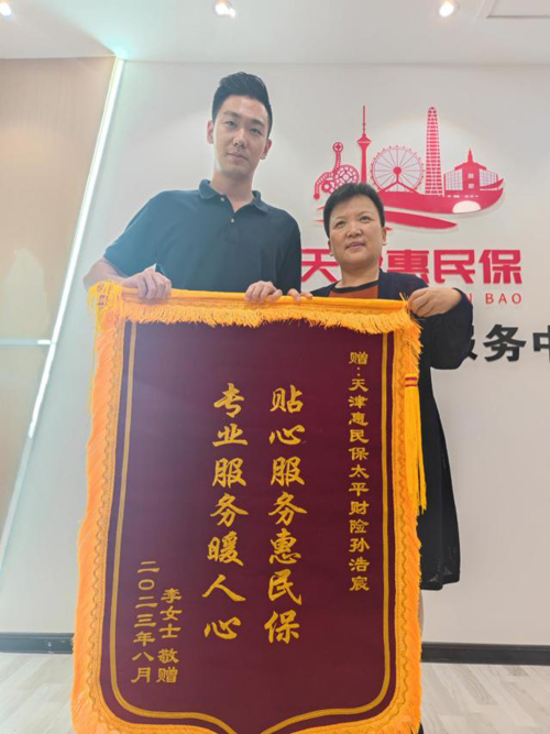 近日,太平财险天津分公司员工孙浩宸接收到了来自惠民保客户李女士赠送的题为“贴心服务惠民保 专业服务暖人心”的锦旗,表达了对孙浩宸同志热情周到、高效便民服务的衷心感谢。这是孙浩宸同志在最近半个月以来获得的第二面锦旗,这充分地体现了孙浩宸同志爱岗敬业、恪尽职守、兢兢业业、无私奉献的精神。