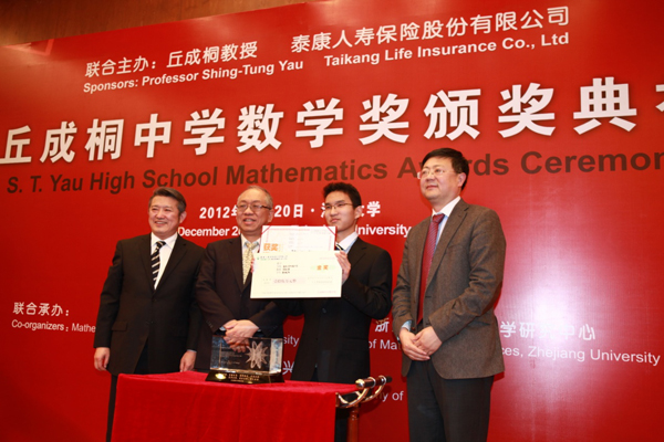 由丘成桐教授、泰康人寿保险股份有限公司共同发起设立的丘成桐中学数学奖第五届颁奖典礼于12月20日在清华大学隆重举行。清华大学附属中学的邵城阳摘取金奖,获奖论文题目是《论两个函数方程解析解的渐进性质》,奖金15万元。