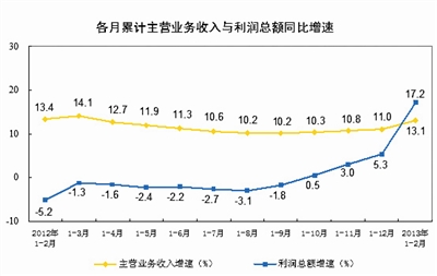 国家统计局工业司何平博士称,1-2月利润增速较高,主要是受去年同期基数较低的影响(去年同期负增长5.2%),如果与2011年同期相比,规模以上企业利润增长11.1%,两年年平均增长5.4%。其中,国有及国有控股企业利润比2011年同期下降4.5%,年平均下降2.3%。