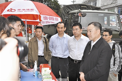 保监会主席助理黄洪等保监会领导看望慰问临时理赔服务点员工。