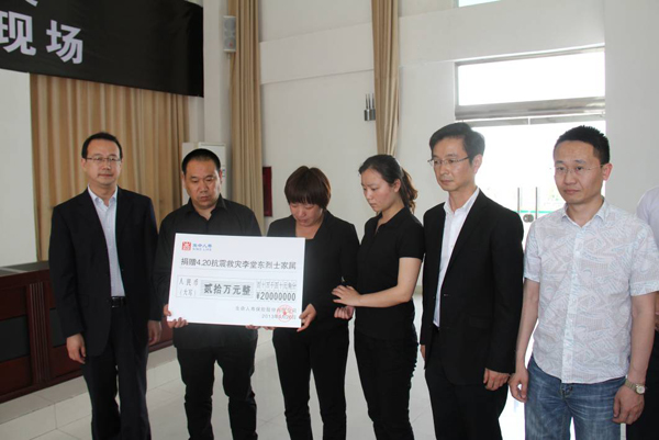 为了让员工的爱心能够发挥最大的效用,生命人寿总公司委托四川分公司在灾区寻找捐助项目。最终生命人寿决定将员工捐助的首批善款献给在雅安芦山地震抗震救灾中牺牲的烈士家属。4月26日下午在烈士所在部队——解放军31集团军驻眉山某部举行了抗震救灾牺牲烈士慰问金发放仪式。生命人寿向每位烈士家属捐赠20万元,共40万元的捐赠款送到了杨波和李堂东两位烈士的家属手中。此次捐赠在烈士所在部队、烈士家属的双方见证下顺利完成。(生命人寿天津分公司)