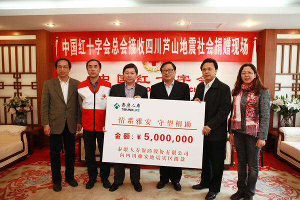 4月21日上午,泰康人寿总裁刘经纶一行早早地来到中国红十字总会,亲自将泰康人寿向四川雅安地震的500万元捐款捐出,以争取捐款能及时地用于救灾物资采购及灾后重建。中国红十字总会会长华建敏亲到现场接受捐赠。据中国红十字总会称:“泰康人寿是雅安地震后第一家向中国红十字总会进行大额捐赠的企业。”