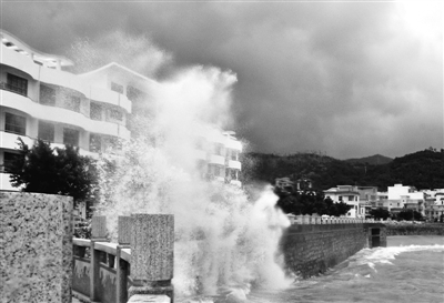 附近风急浪高,数米之高的巨浪直逼海堤。南澳街道海域附近的大小渔船全部开往避风港。CFP/图