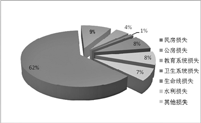 2003年—2010年,云南省地震灾害总经济损失为117.87亿元。其中,民房损失73.29亿元,占62.18%;公房损失10.76亿元,占9.13%;教育、卫生系统损失6.34亿元,占5.38%;生命线系统损失9.67亿元,占8.20%;水利系统损失9.13亿元,占7.75%;其他损失8.68亿元,占7.36%。