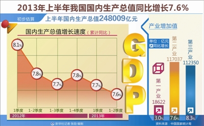本报讯 国家统计局7月15日发布初步核算数据,按可比价格计算,上半年中国国内生产总值(GDP)同比增长7.6%。国家统计局新闻发言人盛来运说,上半年国民经济运行总体平稳,稳中有进,主要指标仍处在年度预期的合理区间。