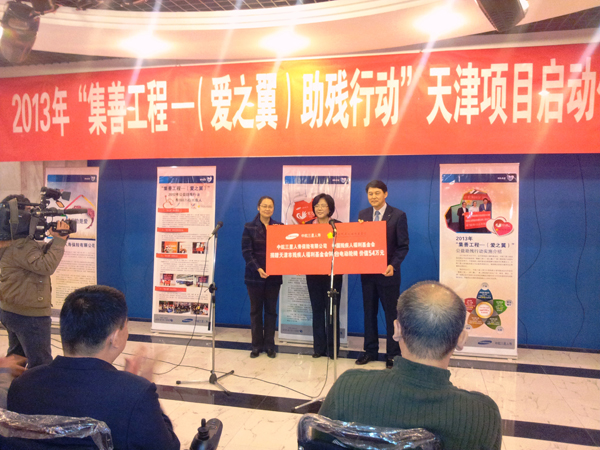 10月23日,中航三星人寿2013“集善工程—(爱之翼)助残行动”二期五大版块之“津门福祉”项目启动仪式在天津市残疾人联合会举行。会上,中航三星人寿现场向天津市残疾人福利基金会捐赠了90辆,价值约54万元的优质电动轮椅,用以帮助残障人士改善出行条件、提升生活品质,这也是天津市首次接受电动轮椅的捐赠项目。
