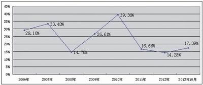 截至2013年10月,全行业实现车险保费收入3805亿元,同比增长17.39%,较2012年提高3.11个百分点,为2011年以来增速最高的一年(见图1)。2012年车险行业步入盈利下行周期,2013年继续下滑,预计全行业仍可实现盈利,但已接近盈亏平衡点,且盈利主要集中在大公司。