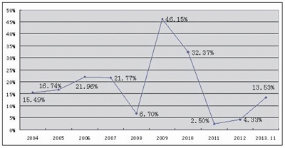 增速提高的主要原因是汽车市场回暖。2013年1-11月,全国汽车产销分别为1998.93万辆和1986.01万辆,同比增长14.34%和13.53%,增速明显提升(见图2)。