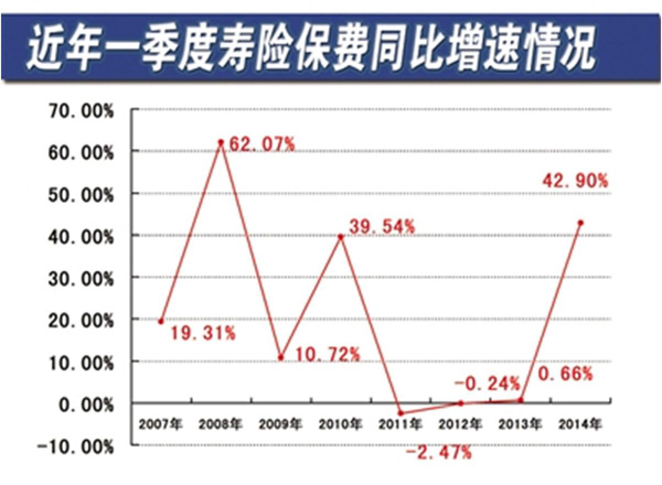 近日,中国保监会公布今年一季度保险行业经营情况。数据显示,今年一季度,保险行业原保险保费收入6999.78亿元,较去年同期大增35.90%,其中寿险原保险保费收入同比增速更是达到42.90%。据《中国保险报》记者统计,从2007年至2013年,每年一季度寿险原保险保费收入同比增速分别为19.31%、62.07%、10.72%、39.54%、-2.47%、-0.24%和0.66%。寿险保费增速变化如“过山车”上下波动。
