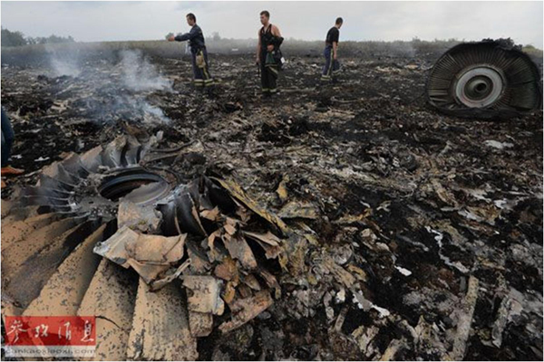 马来西亚航空公司MH17航班17日在靠近俄罗斯边界的乌克兰东部地区坠毁,机上共有乘客和机组成员295人。这是7月17日在靠近俄罗斯边界的乌克兰东部地区拍摄的客机坠毁现场。新华社/俄新社