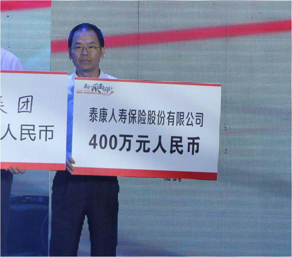 7月24日,在海南省7•18超强台风赈灾义演晚会上,受泰康人寿董事长兼CEO 陈东升委托,副总裁邱希淳代表泰康人寿向海南省台风受灾地区捐赠人民币400万元,支持海南灾后重建。