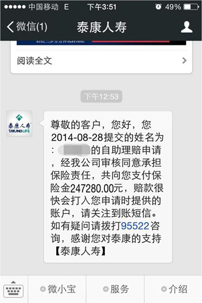 2014年8月21日清晨,被保险人在家中突发心脏病,经抢救无效,不幸身故。得知客户出险信息后,代理人第一时间便来到客户家中进行慰问。面对年仅30岁的女儿突然离世,年迈的父母泪流满面、心痛至极,许久都无法从悲痛中平复下来。代理人在安抚客户的同时,便想到了刚刚宣导过的易理赔已能够申请津贴、重疾和身故险种,随即,代理人便帮客户整理了相关的理赔材料,拍照后在自己的微信上为客户提交了理赔申请。经过分、总公司的审核,3个工作日后,24.7万余元的身故保险金便顺利转入受益人的银行账户中。代理人在收到结案信息后,由衷的感慨易理赔服务又快又好,说:“以前为客户代办理赔的时候,如果缺少资料了,总是要东奔西走的,现在用微信就可以解决问题了,真是太方便了。而且,以前如果申请这么大额的理赔,怎么也要两个星期才能结案,现在居然这么快就到账了。”虽然逝者已去,但也正是被保险人的高风险意识促使她在生前为自己投保了高额的保障,身故理赔金的给付虽不能完全抚慰逝者家属,但却在风险来临时,能够让被保险人对家人的爱得以延续,为已尽责,让家无忧!