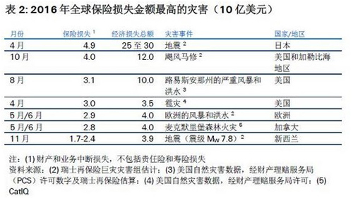 · 2016年,灾害事件造成的保险损失为540亿美元,比2015年上升42%,达到2012年以来的最高值