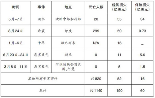 从经济损失和保险损失的角度来看,2016年,该区域最重大的灾害事件是春末发生在欧洲西部和中部的洪水。欧洲最引人瞩目的大灾难还包括意大利中部的一系列地震:8月24日,意大利中部拉齐奥大区列蒂省发生6.0 级地震,造成近300人死亡人;同年10月30日,意大利发生了自1980年以来最强地震,震级6.6,造成至少60亿美元经济损失,但是由于保险市场渗透率较低,保险损失相对来说较少。2016年,虽然欧洲大陆没有发生任何历史上重大的风暴,但六个值得关注的风暴袭击了欧洲,其中玛丽塔(Marita),鲁齐卡(Ruzica)和珍妮(Jeanne)风暴最具破坏性,总保险损失归因于这一风险事件超过8亿美元。