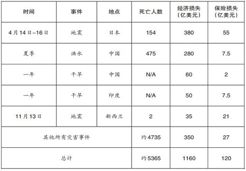 亚太地区最严重的单一损失事件是4月14日和4月16日发生在日本熊本县的一系列地震,九州岛地区超过18.66万多个的住宅,商业和公共设施受损。其他地区也发生了地震损失:2月份台湾高雄发生地震,导致120人死亡,经济损失7.5亿美元;11月份新西兰凯库拉发生地震,造成经济损失35亿美元,保险赔付估计达到60%;2016年,受厄尔尼诺现象影响,中国南方11个省份在梅雨时节遭受了灾难性洪灾,最因人注目的是夏季长江流域大部分地区的洪水泛滥:造成至少475人死亡,50万座房屋受损,经济损失达到280亿美元,但保险覆盖率不足3%。其他重大洪水灾害事件也出现在中国东北部,澳大利亚东南部以及整个印度夏季季风时节。干旱也给部分地区带来数十亿美元的经济损失,如中国,印度和泰国。此外,台风给斐济、斯里兰卡、中国以及韩国等地区带来至少10亿美元损失。