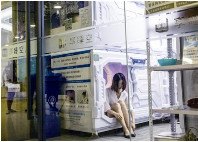 北京中关村创业公社地下二层的“享睡空间”,一位女孩休息过后穿鞋离去。