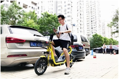 北京丰台区六里桥一处居民区外,一位市民选择近日较火的共享电瓶车出行。
