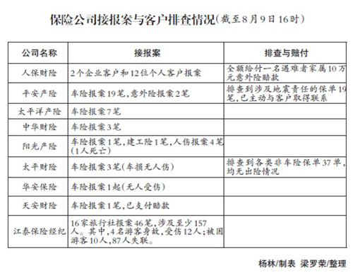 针对此次事故,泰康保险集团开通多项应急服务举措。一是通过互联网地址筛查灾区范围内的投保客户清单,主动向客户发送灾情提示短信,提示理赔服务流程。二是开通救灾语音专属通道,受理客户咨询和理赔。三是快速优先受理灾区客户一切理赔,对受灾地区客户提供康乃馨慰问服务。四是客户可通过泰康官微自助申请,拍照上传理赔材料,理赔申请时可免去纸质材料。五是客户保单丢失的,不用再申请补发保单,可直接申请理赔处理。六是因本次灾害出险需紧急救治的客户,公司不再限制其就诊医院范围;客户因本次灾害直接导致的意外伤害事故而发生门诊或住院治疗的,公司不再扣除其自理项目及自理药品的费用。七是对于因本次灾害导致的身故客户,政府机关出具的失踪证明或殡仪馆的火化证明、通知单可作为死亡证明资料;如仍难以提供的,由公司调查人员主动上门核实属实的,可免于提供相关单证。八是对于家财险、小微企财险客户在灾害事故中遭受损失的,提供在线直赔服务,可通过微信、支付宝、APP等方式申请在线直赔。