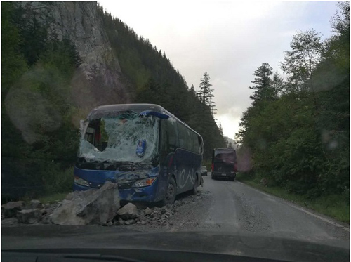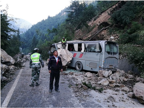 中华财险阿坝中心支公司救灾车队行进到九寨沟干海子灾害现场时,看到有车辆被滚落的石块砸中。该路段现已封路,正在全力抢修中。