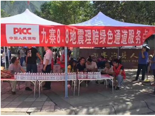 人保财险四川省分公司在九寨沟县医院门口搭建临时报案点,为客户提供理赔绿色通道。