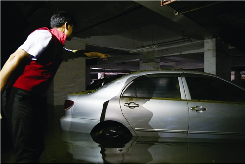人保财险珠海市分公司的理赔查勘人员到某小区地下车库,打着手电筒查看车辆泡水情况。