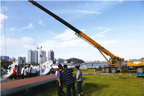 珠海金湾码头,游艇和码头浮桥被台风巨浪打上岸。据码头负责人介绍,游艇和码头设施均已投保,等台风结束后,保险公司将查勘理赔。