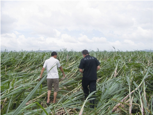 台山市海宴海侨农场南丰村约5000亩甘蔗受台风影响倒伏。阳光农业相互保险广东分公司紧急赶往现场查勘定损。卢胜波/摄