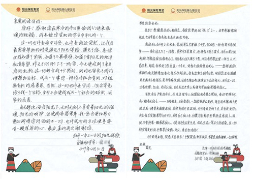 两年资助,两年情深。阳光保险扶贫事业的用心、贴心、暖心也得到了孩子们的积极反馈。从他们陆续寄给守护他们的“张伯伯”的来信中足以看到,在阳光温暖和正能量的感召下,孩子们的人生梦想正扬帆起航,迈向希望的彼岸。