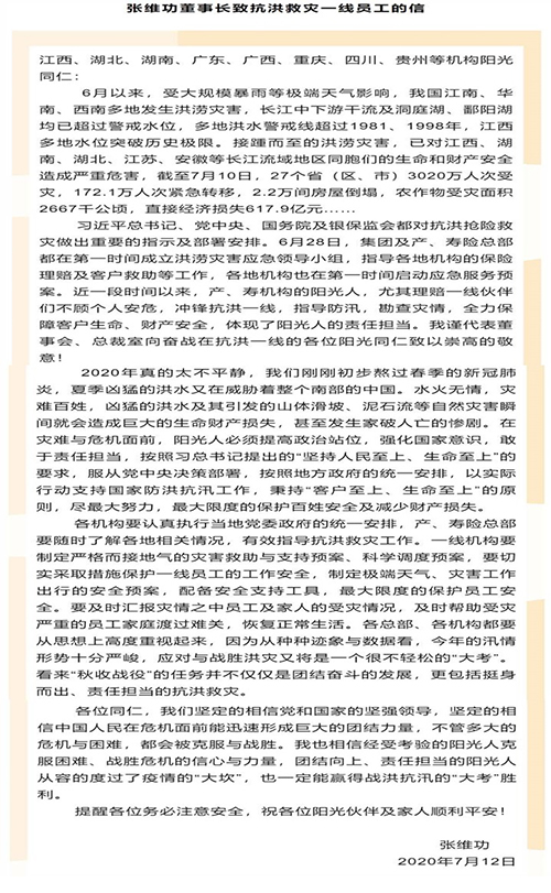风雨无情,阳光有爱。阳光保险将持续、密切关注各地灾情的最新进展,积极为受灾群众提供生活基本所需,并配合监管部门及当地政府做好各项理赔工作。
