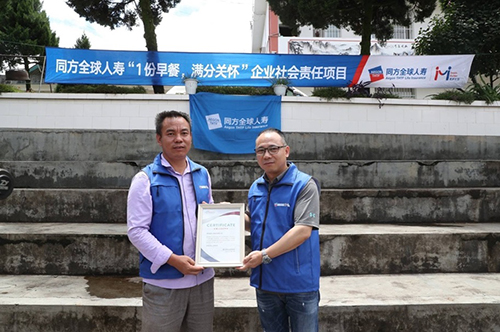 除此以外,在7.22品牌日期间,同方全球人寿募集了4000份同方全球「药宝保」特定药品费用医疗保险,其中1000份捐赠给了云南怒江地区“1份早餐”受助的两所学校和当地的蛮云学校,3000份捐赠给了中华少年儿童慈善救助基金会大病医保专项基金。在捐赠仪式上,石校长代表云南地区受助学校,向同方全球人寿颁发了爱心捐赠证书。