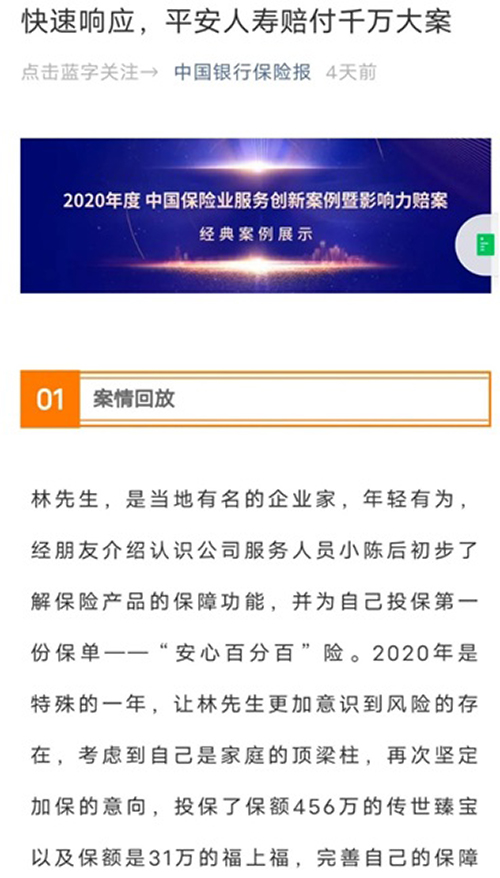 中国保险业年度服务创新案例暨影响力赔案征集活动由银保监会唯一工作日报《中国银行保险报》主办,活动旨在树立保险业良好社会形象,促进保险机构进一步落实维护消费者合法权益主体责任,全面展现各保险公司优质理赔服务和持续改进服务的品牌形象。本次平安人寿多项案例入选,充分代表了媒体及公众对平安人寿“有温度的保险服务”和不断创新升级的智慧服务的认可!