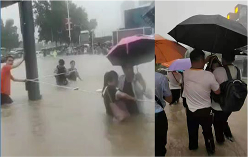 7月20日,在郑州市地铁1号线民航路站口,因为积水已经漫进地铁站,群众开始撤离,阳光人寿河南分公司银保部韩宜衡看着孕妇及儿童在水中艰难前行,他心急如焚,赶忙找来绳子,沿着地铁入口拉起了“警示线”,协助行人安全顺利撤离。随后,阳光人寿商丘中支刘子琛、高博,也主动加入到护送孕妇及儿童的队伍中。他们两个人分工配合,一个人撑伞、一个人抱起孩子,来来回回,反复护送。近两小时的引导和护送,虽然全身湿透,但是他们的心却是火热的。