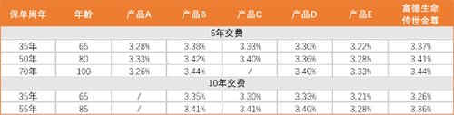 在比较中,我们主要选取目前市面上收益处于第一二梯队的增额终身寿险产品。从上图可以看出,在5年交费时,“传世金尊”在保单35年时IRR3.37%,处于行业靠前水平;随着时间增长,“传世金尊”现金价值展示出爆发力,IRR不断靠近3.5%的上限,内部收益率在行业同类产品中处于前列。在10年交费时,“传世金尊”的内部收益率和第一二梯队平均水平相差不大。因此如果希望短期交费,并期待保单的现金价值带来长期增长,“传世金尊”在同类产品中更有竞争力。