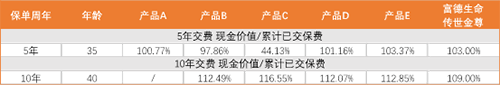 上图通过比较现金价值和累计已交保费的比值可以看出,不管是5年还是10年交费期的“传世金尊”,保单内的现金价值都可以在交费期结束时追平保费,并且5年交费期的“传世金尊”的早期产品利益在同类产品中处于靠前位置。追平保费时间越早,也意味着资金可支配的灵活度更高。