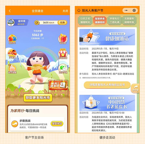 再如此次的“绿色环保行、低碳健步走”活动,在传统的走步得积分基础上,增加了战队、商城、“步数宝”等多种玩法,客户节期间,活动当日客户登录“我家阳光”App ,打开全民健走,完成6000步挑战任务即可收获3倍好礼。只要每日健康走步就能从中收获到满满的成就感和精美的礼品,客户纷纷表示“既健康又有趣!”