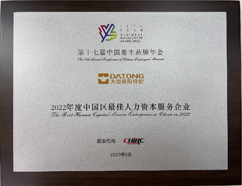 2023年2月25日,由中企联合CHIRC发起主办,总裁读书会、HRise联合主办,帆软协办的,以“守正创新:高质量发展”为主题的“第十七届中国雇主品牌年会”在北京召开,来自各人力资源服务公司、互联网科技公司相关负责人、高校专家等近150人参加了本次年会。在此次年会中,大童保险经纪有限公司凭借近年来在人力行业的突出表现荣获“2022年度中国区最佳人力资本服务企业”奖。