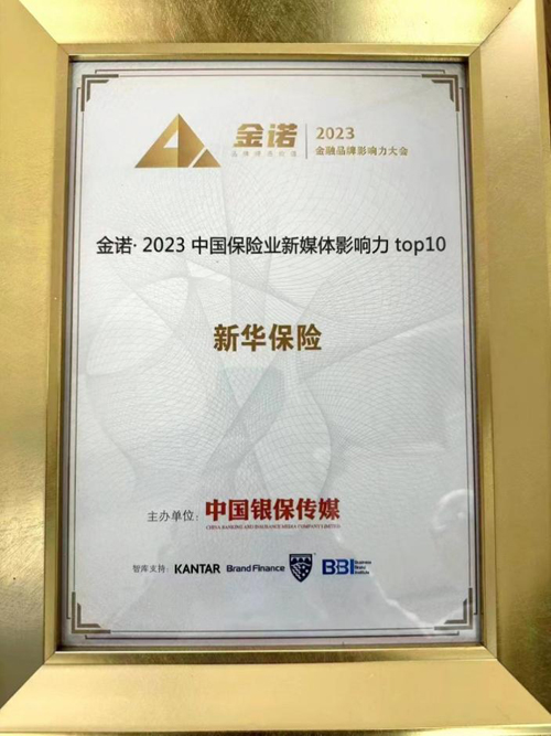 5月9日,中国银行保险报主办的“迈向时代新征程 焕发品牌新动能”的第七届金融品牌影响力大会在厦门举办,会上发布了《2023中国金融品牌影响力指数报告》及2023银行、保险、信托新媒体影响力榜单。新华保险凭借出色的新媒体运营、持续攀升的品牌影响力和社会责任项目分别荣获“金诺·2023中国保险业新媒体影响力top10”和“金诺·中国金融年度优秀社会责任项目”两项大奖。