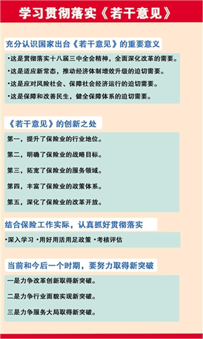 据测算,《若干意见》中各类政策措施一共有58项,其中对以往政策的重申有21项;过去没有明确但在实践中已经执行,这次以文件形式明确下来的政策有6项;根据中央全面深化改革的要求,结合保险行业自身发展需要,新提出的有31项。“《若干意见》的出台来之不易,国务院也已经制定出贯彻落实《若干意见》的时间表,全行业一定要倍加珍惜,强化机遇意识和使命担当,抓好政策落实,用好用活用足政策。”项俊波说。