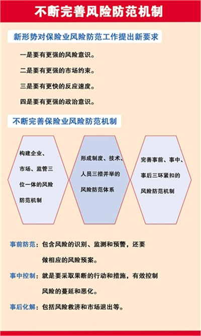 “保险业发展多年一直是顺风顺水,确实还没有经历过完整的经济周期考验,没有经历过大的系统性风险洗礼。所以我们必须高度警惕,有针对性地做好风险防范工作。”项俊波提出,构建企业、市场、监管三位一体的风险防范机制,形成制度、技术、人员三措并举的风险防范体系,完善事前、事中、事后三环紧扣的风险防范机制等。