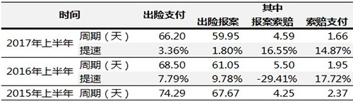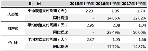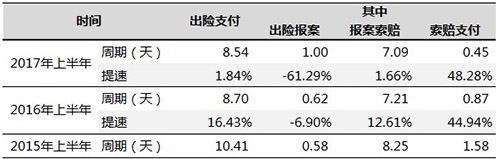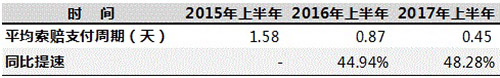 1.车险。2017年上半年车险小额理赔平均索赔支付周期为0.45天,同比提速48.28%。从公司看,车险小额理赔平均索赔支付周期超过5个自然日的公司是安华农业(6.95天);未超过5个自然日但相对较长的10家公司是渤海财险(2.91天)、华海财险(2.75天)、鼎和财险(1.83天)、国泰财险(1.79天)、安邦财险(1.66天)、信达财险(1.41天)、永安财险(1.37天)、阳光农险(1.33天)、中煤财险(1.33天)和长安责任(1.25天)。