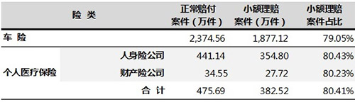 2017年上半年,车险正常赔付案件2374.56万件,其中小额正常赔付案件1877.12万件,占全部正常赔付案件的79.05%。个人医疗保险正常赔付案件475.69万件,其中小额正常赔付案件382.52万件,占正常赔付案件的80.41%。个人医疗保险小额正常赔付案件中,人身险公司案件354.80万件,占比92.75%;财产险公司案件27.72万件,占比7.25%。