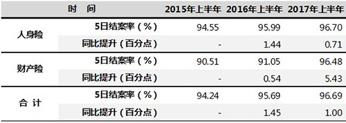 1.车险。2017年上半年车险小额理赔5日结案率为98.69%,同比提升1.73个百分点。从公司看,车险小额理赔5日结案率低于80%的公司是安华农业(65.89%);未低于80%但相对较低的10家公司是华海财险(86.03%)、渤海财险(88.02%)、安邦财险(92.60%)、鼎和财险(94.78%)、永安财险(94.78%)、中煤财险(94.80%)、英大财险(95.00%)、国泰财险(95.03%)、长安责任(95.87%)和都邦财险(96.13%)。