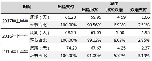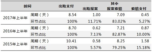 2017年上半年车险小额理赔平均出险支付周期为8.54天,同比提速1.84%。从各环节周期占比看,出险至报案同比延迟61.29%,报案至索赔同比提速1.66%,索赔至支付同比提速48.28%。