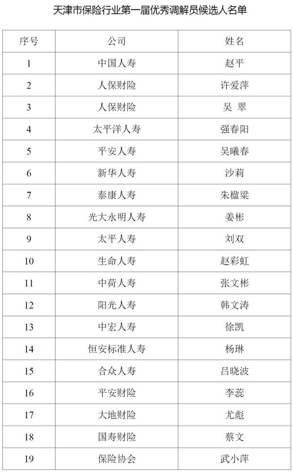 为进一步推进新时期保险纠纷多元化解机制建设工作的开展,发挥先进人员的示范引领作用,弘扬“调解纠纷构建和谐”的调解理念,在全行业营造爱岗敬业、担当尽责、勇于探索、甘于奉献的良好氛围,按照《天津市保险业优秀调解员、人民调解员评选办法》要求,根据初审和复审结果,确定下列人选为天津市保险行业第一届优秀调解员、人民调解员候选人(排名不分先后),现予以公示。公示时间:2018年6月20日—6月25日,如有异议,请向天津市保险行业协会、保险学会反映,监督电话:022-23112145、23124352。