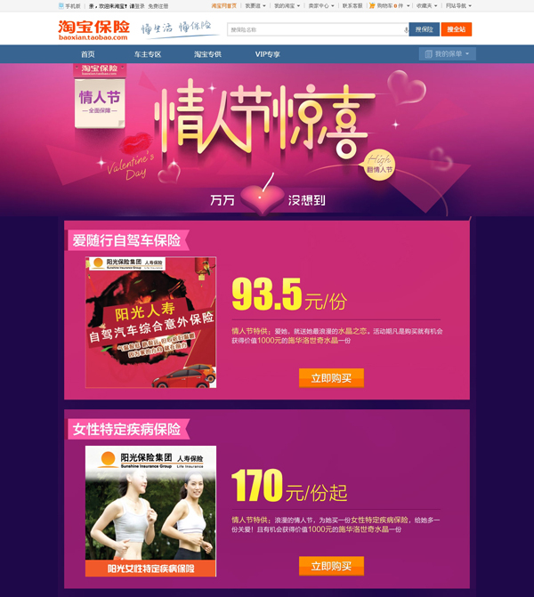 最近,淘宝网就在其创新类目——保险频道上悄然上线了情人节专题网页,由阳光人寿开发的一对“鸳鸯保险”占据了醒目位置,成为了2014情人节一款爆点十足的礼品,上线数日便取得了可观的销量。