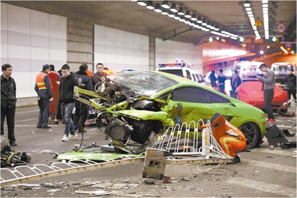4月11日,被京城飙车族称为市内飙车胜地的朝阳区大屯路隧道内,一辆红色法拉利和一辆绿色兰博基尼发生严重交通事故。